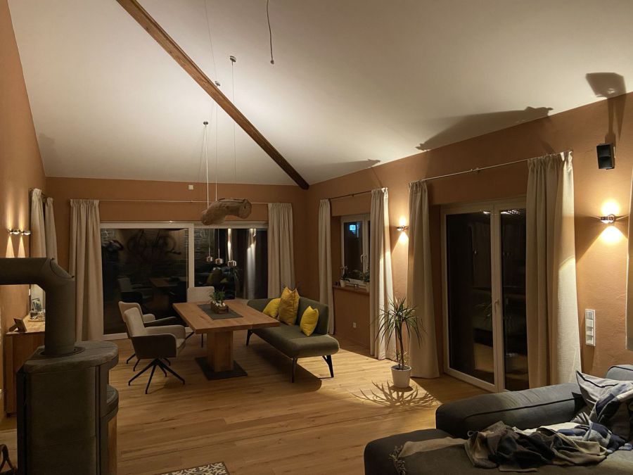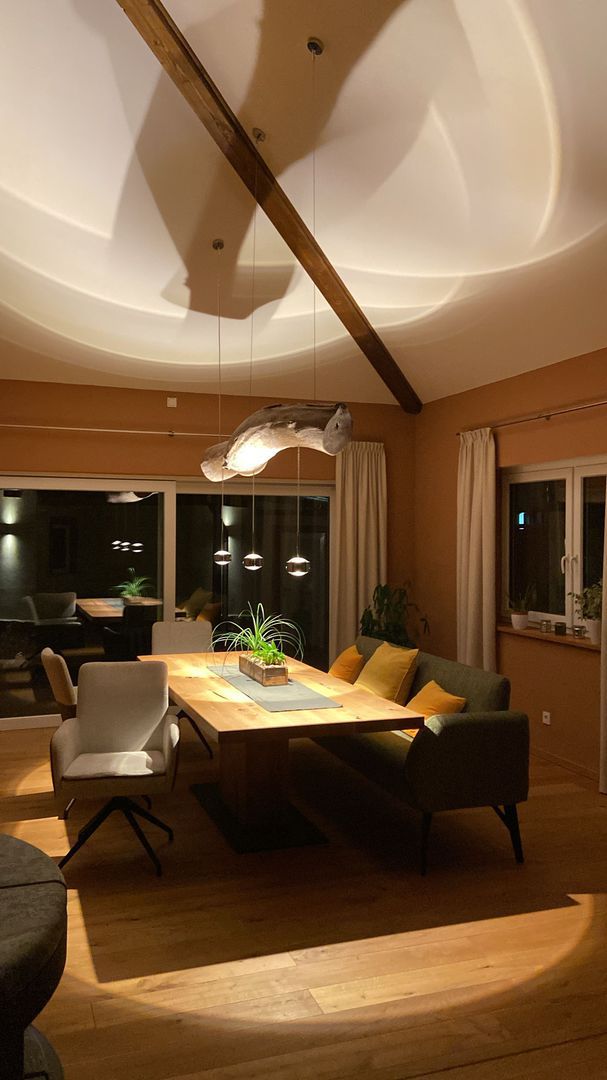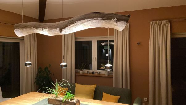 Kunden Holz lieben, Treibholz sammeln, kann sowas herauskommen. Ein massiver Stamm scheint über dem Esstisch zu schweben. Die Decke über ihm leuchet hell.