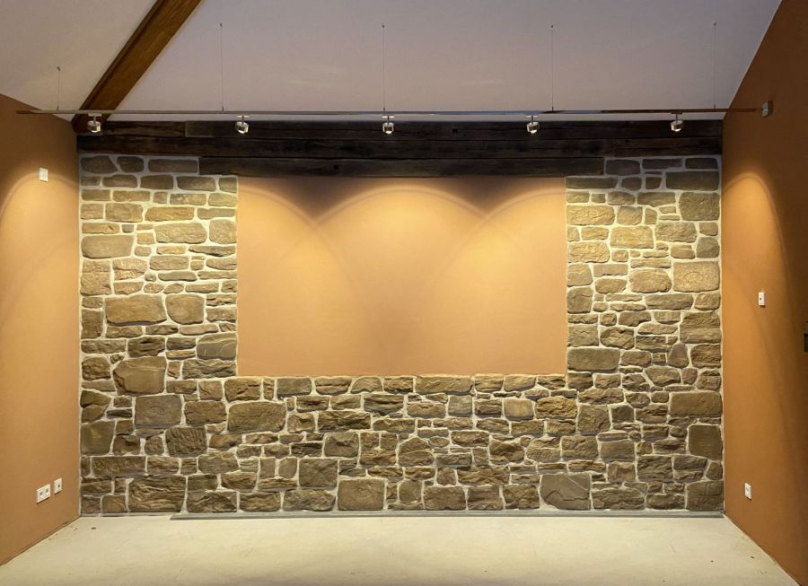 Vor der gegenüberliegenden Wand haben wir ein abgehängtes Schienensystem mit passenden Strahlern eingesetzt.